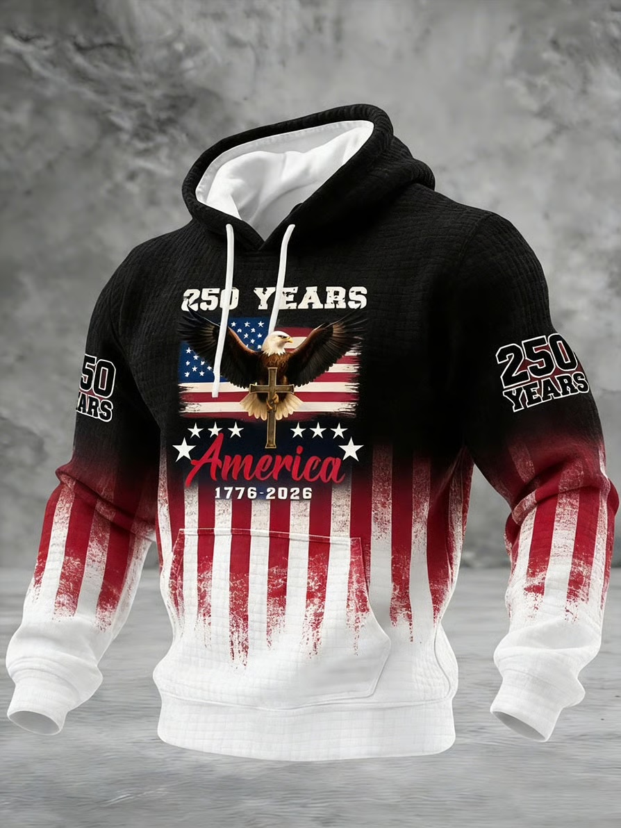 Men's Casual American 250th Anniversary (1776-2026) Print Sweatshirt - Patriotic Eagle & USA Map Graphic Waffle Knit Color Block Hooded Pullover with Star-Stripe Sleeves