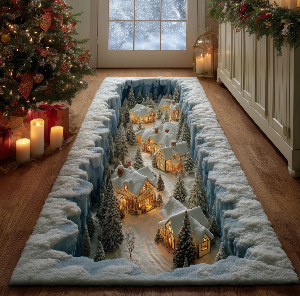 Enchanting Christmas Town Runner Rug with Snow-Covered Cottages & Sparkling Snowfall Pattern | Christmas Town