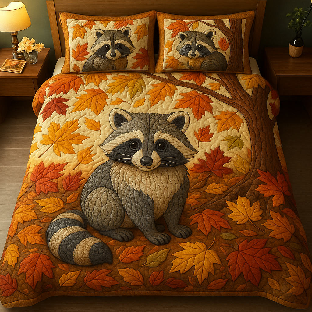 Autumn Raccoon Quilted Bedding Set ⚡ Cozy 3-Piece Fall Design